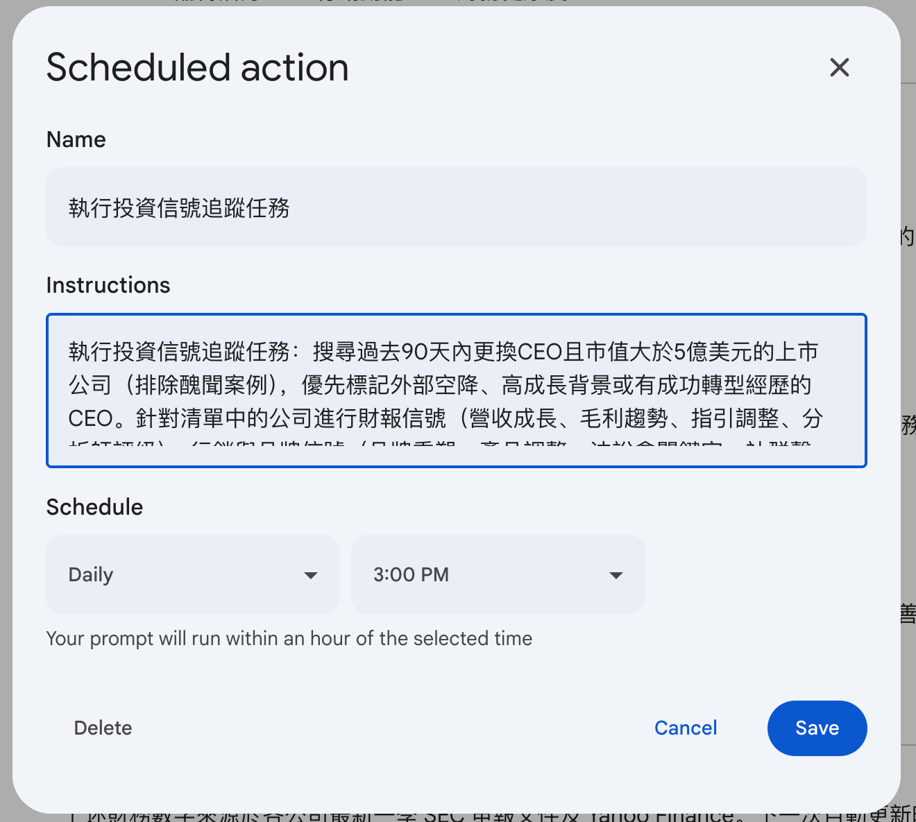 我在Gemini裡設定了一個每天下午3點自動執行的排程任務。下面是我用的完整Prompt,你可以直接複製使用: