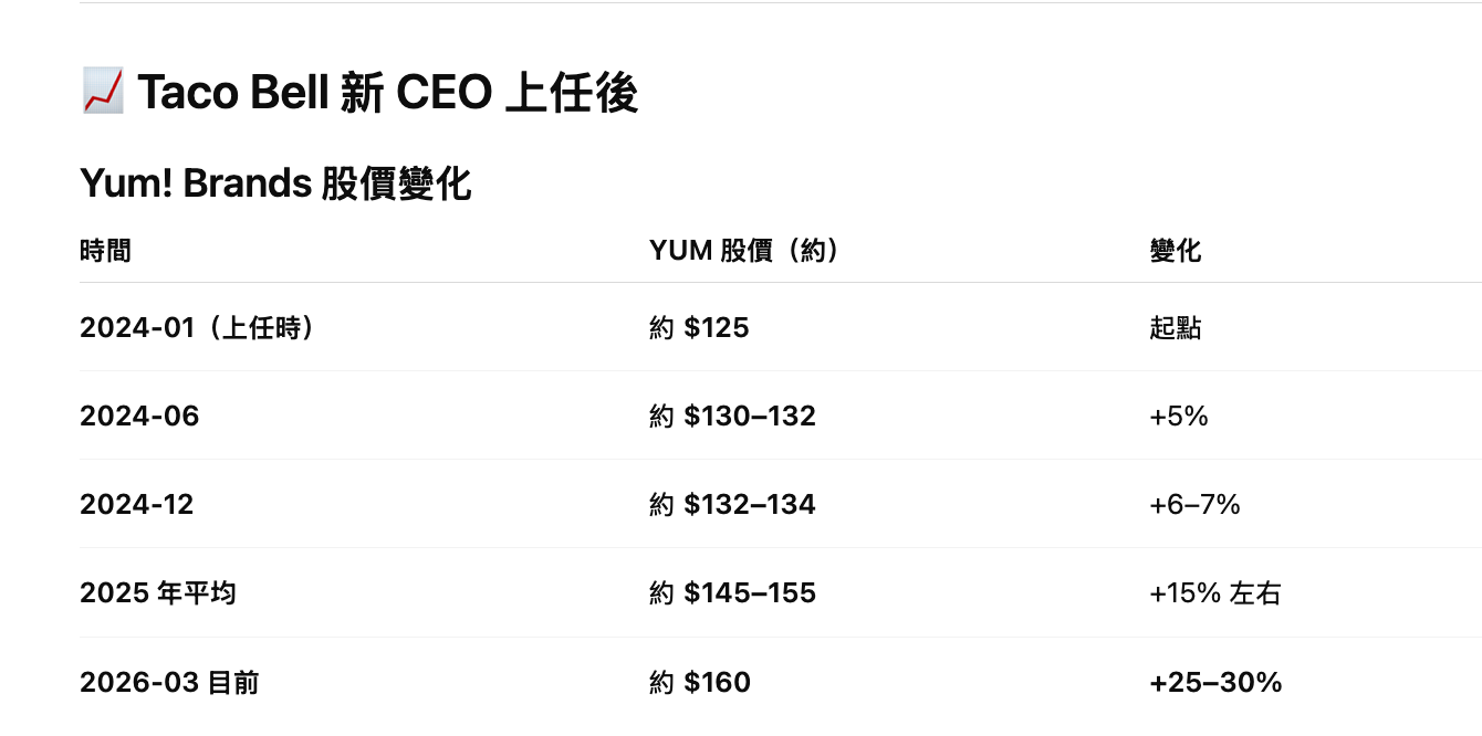 同樣的模式。新 CEO Sean Tresvant 上任後,股價有了明顯的提升(Taco Bell 是 YUM 集團近年業績增長最好的品牌,YUM 旗下還有 KFC、Pizza Hut、Habit Burger)。